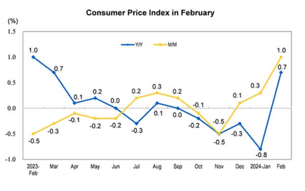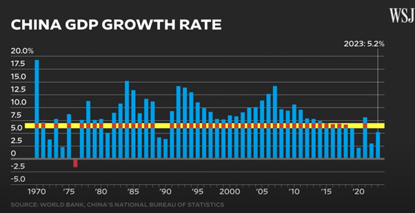 Although in February 2024 there was a big rise in the CPI, China coped with a few months of deflation. Deflation can be really dangerous for an economy since consumption is generally delayed which causes more deflation. At the moment China's population shows signs of weak consumer spending, which is in harmony with the CPI. The amount of deflation can be uncertain, as one can see in the graph of the National Bureau of Statistics, but there is no denying that China is in a period of slow growth as can be seen in the following graph.