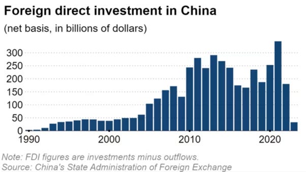 To begin with, foreign investments have not been so low in China for 30 years. An 80% decline in foreign investment in 2023 compared to 2022 is softly said not a small nudge. This decrease in foreign investment is, among other things like the rising geopolitical tensions with the West, caused by China’s anti-espionage law which was implemented in July 2023. To guard national secrets, China’s anti-espionage law has the power to potentially shut down companies for mishandling data or technology. Companies are delaying and some are even abandoning planned investments in China due to fear and unintended legal entanglements particularly when working with sensitive data and new technologies.