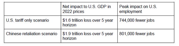 These policies could also have catastrophic consequences for the U.S. After all, the U.S. has reaped substantial benefits from increased trade with China since China’s Permanent Normal Trade Relations (PNTR), i.e. China’s membership in the World Trade Organisation (WTO). As a result of the increased tariffs in 2018, a decrease in output and jobs emerged in the U.S.. In November 2023 Oxford Economics researched the consequences of the escalation of existing tariff measures in the form of revoking China’s PNTR status. In this study, the scenario is modeled in which only the U.S. increases the tariffs. Another scenario that is modeled in this study is that the U.S. increases the tariffs in combination with Chinese policy retaliation, which means that China raises tariffs for the U.S. as well. This second case is, based on policy moves of the last five years, highly likely to happen.