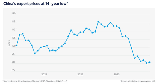 Since China’s economy is in such a low state, the Chinese economy is desperate to improve. One of their main ideas to make this change is growing even more in export. To do this, one of their main strategies is lowering export prices. These prices have been declining since June 2023 and are at their lowest point in 14 years. With these lowering export prices, China hopes to increase demand from foreign countries, to fuel their economy.