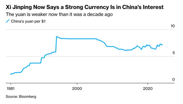 The Yuan's current exchange rate is, as one can see in the graph, currently low, which could be argued that it is undervalued. However, Xi stated in the People’s Congress that wants to be a global financial power. To reach this goal, a strong currency is needed. So it looks like that this lower Yuan is currently not in China’s Interest. But we have to keep in mind that nothing is like what it seems that China presents to the outer world.